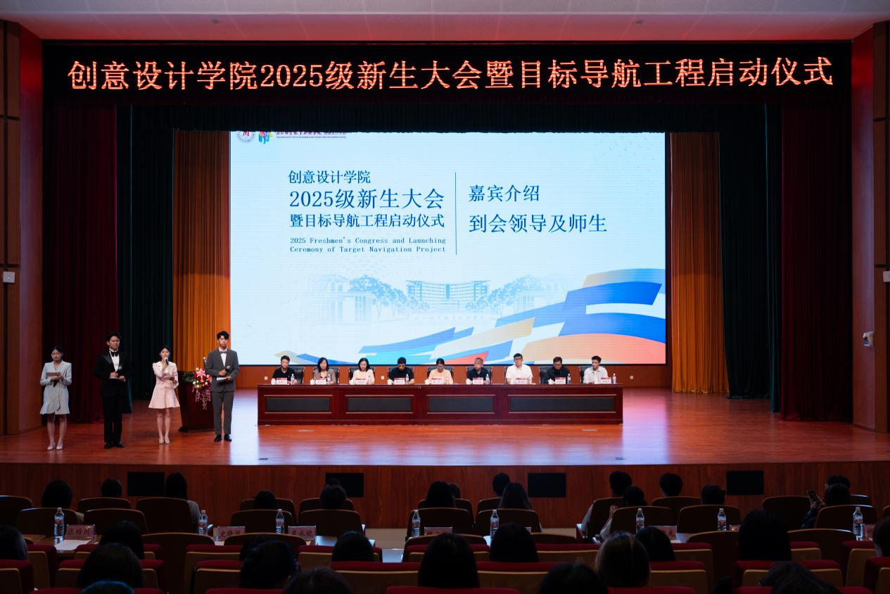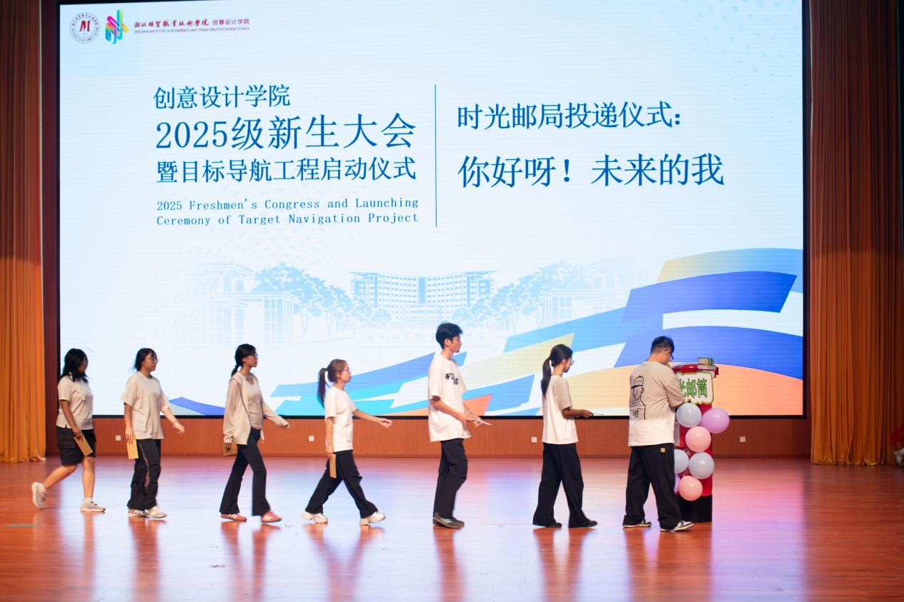10月14日下午,创意设计学院2025级新生大会暨目标导航工程启动仪式在产教融合大楼报告厅举行,学院班子成员、教研室主任、辅导员、新生班主任及2025级全体新生参加。 大会以“榜样引领”“目标启航”“青春飞扬”为篇章,在国歌声中启幕。学院党总支书记、院长谢芳代表全院师生对2025级同学们的到来表示热烈的欢迎。她介绍了学院的基本情况,并指出学院发展始终紧扣国家职教蓝图。她向新生提出“胸怀报国志、主动探新知、常怀包容心”三点希望,并送上诚挚祝愿。 新生班主任代表数字媒体艺术设计专业251、252班主任李博达上台发言,表明将以“守护者、陪伴者、引路人”身份伴新生成长。随后,学院领导为2025级新生班主任颁发聘书。 校友寄语视频《以梦为马,不负韶华,此去繁花似锦,未来尽可期待》播放后,“目标启航”篇章开启。学院党总支副书记裘永晓介绍目标导航工程,提及融入学校“四立教育”与新时代“枫桥经验”,强调树立正确宗教观、维护校园和谐;优秀校友代表会展策划与管理2025届毕业生朱宏财分享了自己在校的学习、实践、志愿服务经历,围绕升本与就业提出发展建议;新生代表会展252班徐静怡发言,愿以创意点亮未来。 第三环节“你好呀!未来的我”时光邮局投递仪式启动,新生将对未来的期许封入信件,定格青春约定。 未来,创意设计学院将以“目标导航工程”为抓手,持续深化“四立教育”,将新时代“枫桥经验”融入日常管理,陪伴新生在创意的沃土上深耕细作。愿2025级学子以今日为起点,以创意为笔、以奋斗为墨,在设计之路上乘风破浪,让青春在为国奉献的征程中绽放绚丽光彩。
