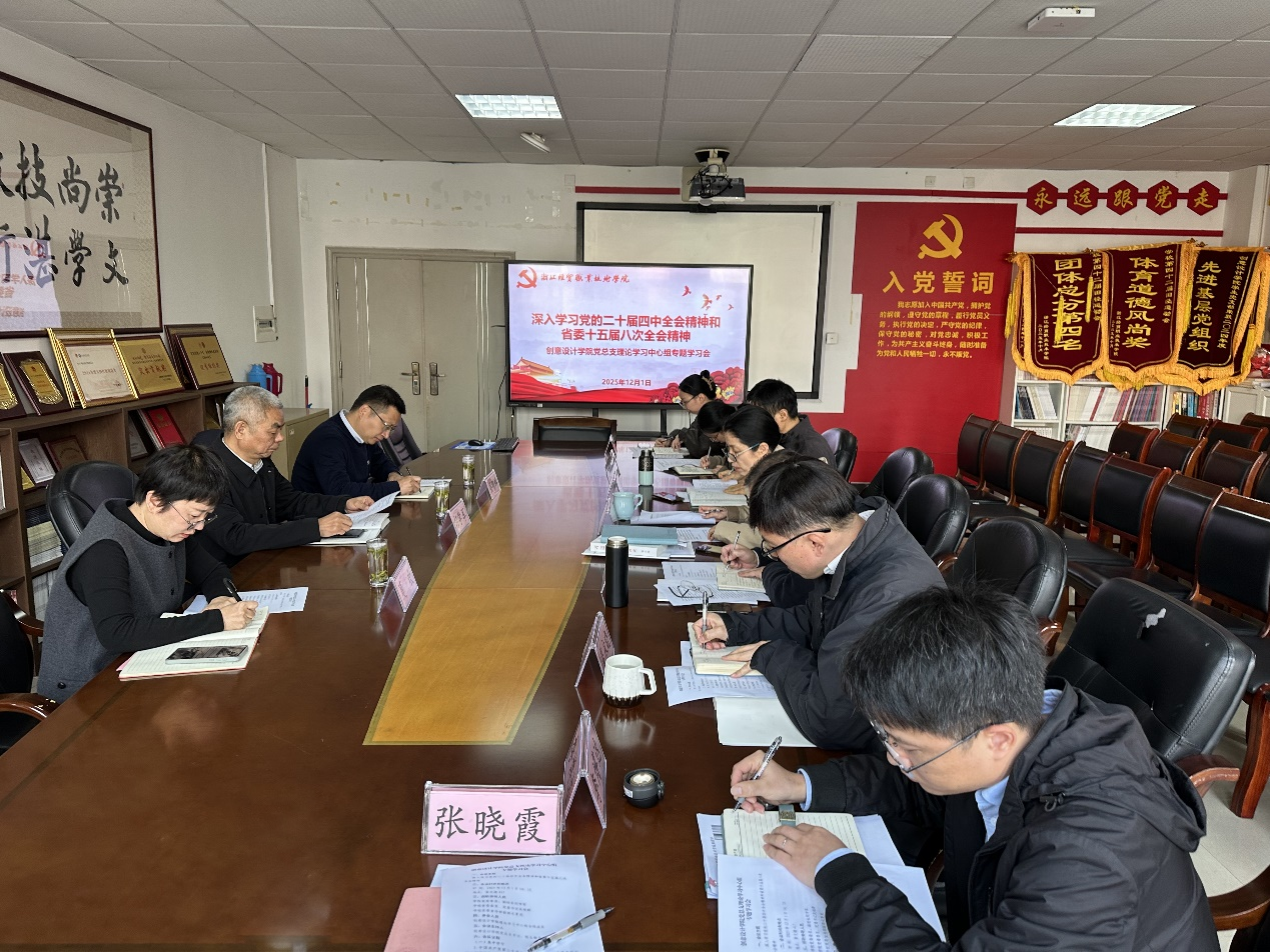 12月1日下午,创意设计学院党总支理论学习中心组在崇文楼417会议室召开专题学习会,深入学习党的二十届四中全会精神。学校党委委员、副校长何学军,党委委员、纪委书记吴刚群,党委宣传部相关负责人到会巡听旁听。创意设计学院理论学习中心组全体成员参加。 会上,全体成员集中学习了《中国共产党第二十届中央委员会第四次全体会议公报》《中共中央关于制定国民经济和社会发展第十五个五年规划的建议》、习近平总书记关于《建议》的说明、习近平总书记对全面依法治国工作作出的重要指示及浙江省委十五届八次全体会议精神。与会同志结合分院发展、教学科研、学生工作等实际,畅谈学习体会。 何学军、吴刚群对本次学习会给予充分肯定。何学军要求,分院要以此次学习为契机,进一步强化理论武装,将全会精神融入学院发展、人才培养、产教融合的全过程;要聚焦“十五五”规划目标打造学院专业特色品牌;要严守安全底线,为学院高质量发展提供坚实保障。吴刚群强调,理论学习是提升政治素养和工作能力的重要途径,要通过原原本本学,联系实际学,深入思考学,有效实现理论武装头脑、指导实践、推动工作的目标。 创意设计学院党总支将以此次学习为新的起点,持续推动全会精神落地见效,为学校事业发展和人才发展贡献智慧与力量。