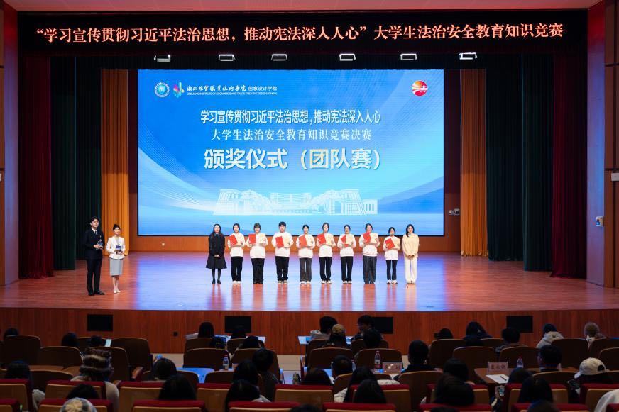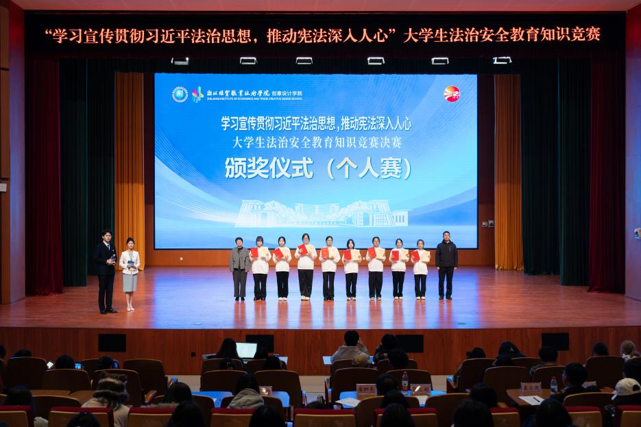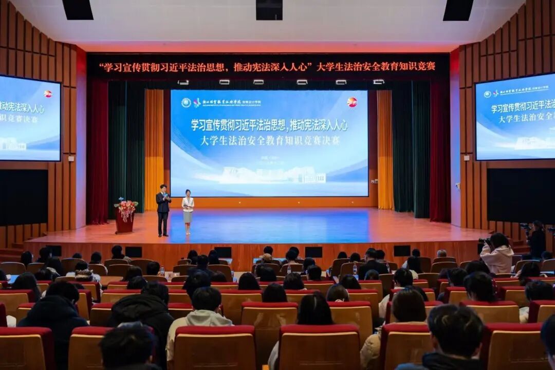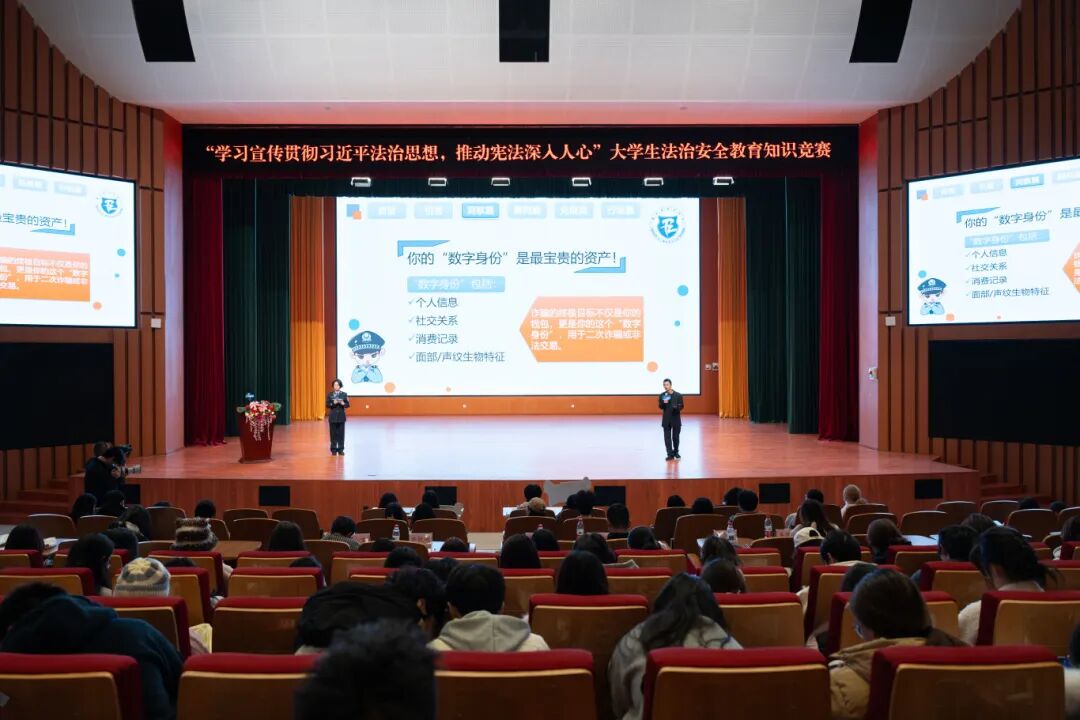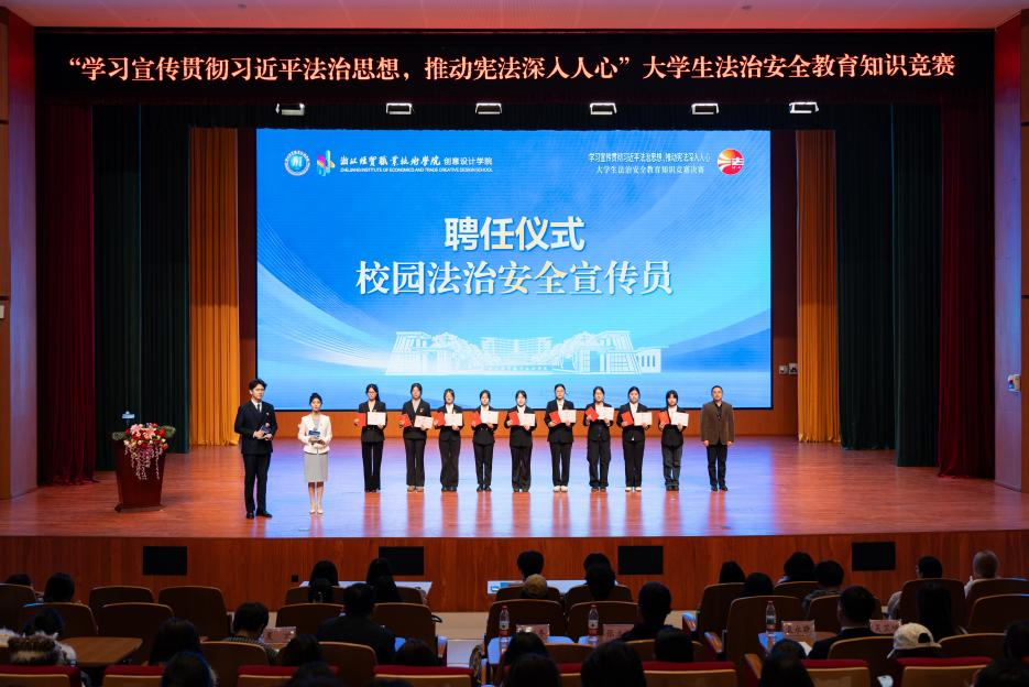 12月2日,创意设计学院举办了“学习宣传贯彻习近平法治思想,推动宪法深入人心”大学生法治安全教育知识竞赛,近千名师生现场参与,以赛促学筑牢青年法治信仰。 活动在雄壮的国歌声中拉开帷幕。 创意设计学院党总支副书记裘永晓在致辞中指出,此次竞赛既是以赛促学的实践,更是筑牢安全防线的重要举措。他希望同学们以此次活动为契机,把法治知识学深悟透,并将法治精神融入日常,做尊法、学法、守法、用法的新时代大学生。 活动现场举行了校园法治安全宣传员聘任仪式。学生处处长金初冬为校园法治安全宣传员颁发聘书,25名同学接过聘书后庄严宣誓“践行法治精神,传播安全理念”。 创意设计学院声乐队演唱《宪法伴我们成长》,悠扬旋律传递法治与青春的共鸣。 主持队朗诵《以吾辈之名,护宪法之光》,激昂语调诠释新时代青年对宪法精神的尊崇。 师生集体观看习近平法治思想专题及宪法宣传视频,深化对法治理念的理解认同。 作为活动重点,知识竞赛分为个人赛与团队赛。初赛阶段,全院863名学生参与线上答题,其中778人取得90分及以上成绩。16位参赛选手经初赛、复赛层层选拔脱颖而出。决赛题目覆盖《宪法》《民法典》《刑法》等多部法律,并延伸至国家安全、网络安全、消防安全及心理健康等实用领域,通过案例分析等形式,考察学生的法治应用能力。 为增强普法实效,活动邀请白杨街道派出所社区民警余铁城开展《如何正确使用110》讲座。 浙江警官职业学院信息技术与管理系学生分享《数字时代生存指南:重塑你的“反诈免疫力”》。 创意设计学院反诈宣讲团则以相声《一本正经的反诈手册》幽默揭秘诈骗陷阱,让法治教育更接地气。 现场互动环节,同学们积极参与知识问答。 “备赛让我打破了‘宪法离生活很远’的认知。”传播与策划252班学生冯悠然表示,案例题让抽象法律条文变得鲜活,真切体会到宪法既是治国安邦总章程,也是公民权益保障线,承诺将践行“学法、懂法、守法、用法”誓言。 此次知识竞赛是创意设计学院宪法宣传周系列活动的重要组成部分。11月下旬以来,学院已组织开展参观“五四宪法”历史资料陈列馆、绘制宪法主题海报等特色活动,让宪法精神在沉浸式体验中深入人心。接下来,学院还将陆续推出晨曦微讲堂、主题团日活动、宪法知识宣讲竞赛等系列活动,持续深化法治教育,引导青年学子将法治理念内化于心、外化于行,为青年成长筑牢法治根基。 潮新闻:https://tidenews.com.cn/news.html?id=3315716 杭州新闻:https://apiv4.cst123.cn/cst/news/shareDetail?id=1180891544735973376&ic=ulcx 钱塘发布:https://nginx-qtrm.hzyun.com.cn/qtrm/site1/mweb/ja0i3/c684614.html?xyt=1764818357157)