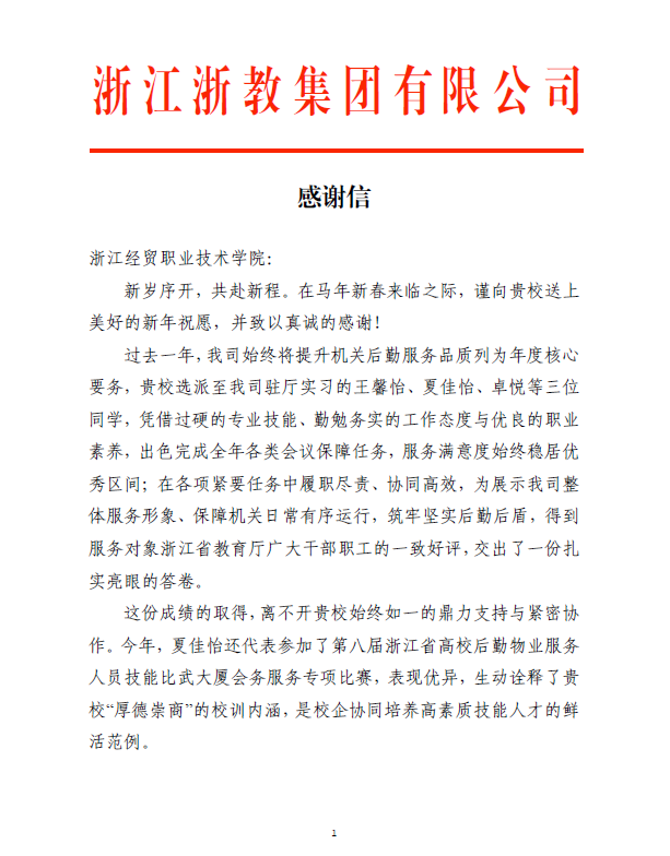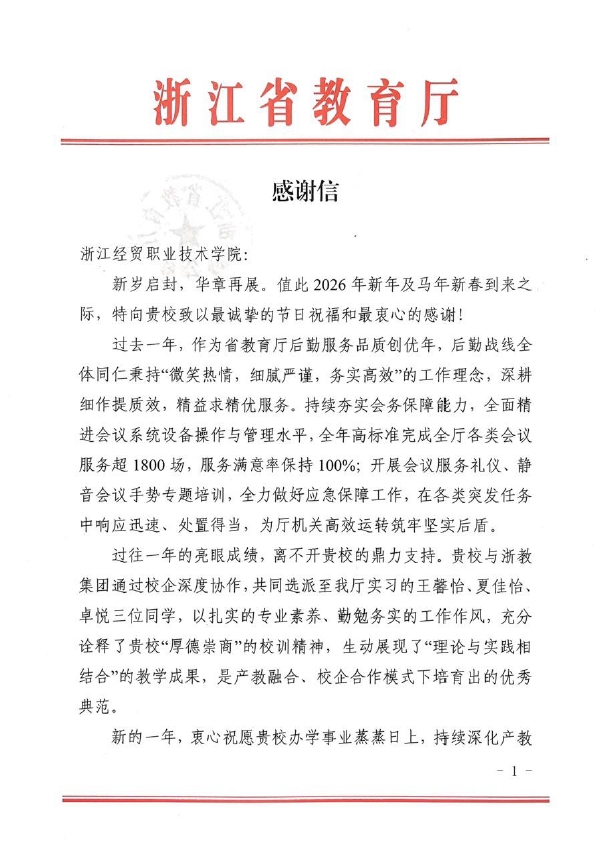 近日,浙江省教育厅办公室、浙江浙教集团有限公司先后发来感谢信,对我校选派至省教育厅驻厅实习学生的出色表现表示感谢,同时对学校在产教融合、校企合作方面的积极探索与成效给予了充分肯定。