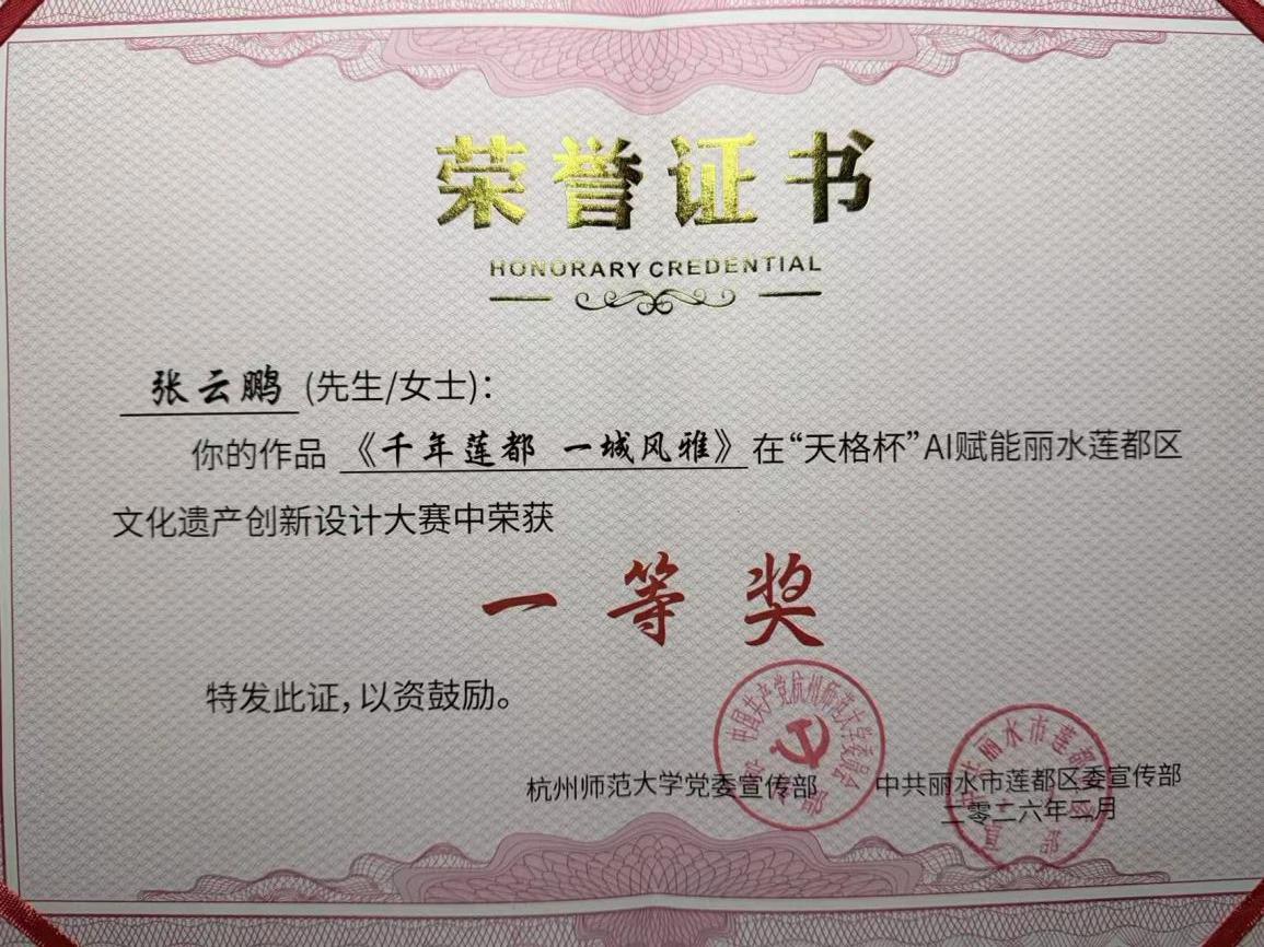 近日,由杭州师范大学党委宣传部、中共丽水市莲都区委宣传部联合主办的“天格杯”AI赋能丽水莲都区文化遗产创新设计大赛获奖名单正式揭晓。学校创意设计学院数字媒体艺术设计专业张云鹏凭借作品《千年莲都 一城风雅》,在百余件参赛作品中脱颖而出,荣获赛道1(写实类)一等奖。 张云鹏以丽水莲都区深厚的文化遗产为创作根基,将AI技术与传统历史文化深度融合。他用数字科技探访历史脉络,以创新设计激活传统魅力,最终创作出兼具文化深度、技术锐度与艺术温度的作品,赢得了专家评审团的一致认可。 此次获奖不仅是对张云鹏专业能力与创新精神的肯定,也是创意设计学院在产教融合、以赛促学人才培养模式下取得的又一成果。未来,学院将继续鼓励学生探索数字技术与文化创意的融合路径,培养更多能赋能传统文化新生的创意人才。